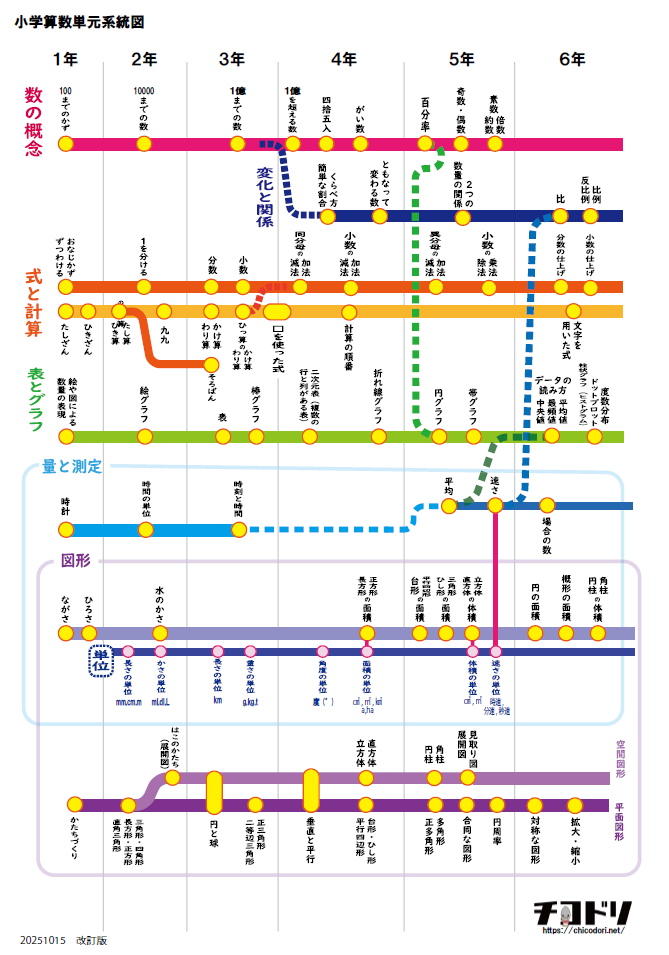 この系統図は、算数の学習内容を「まなびの土台」「トレーニング」「情報の読み解き」「体感型の算数」「感覚と論理の橋渡し」といった観点から整理したものです。
