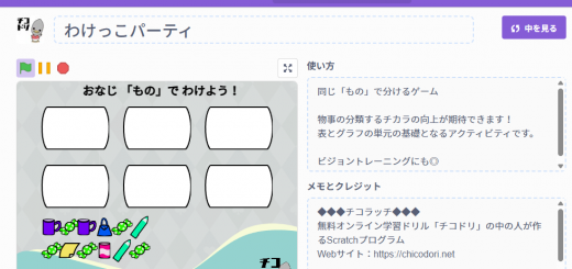 0 1年算数 / すうじ / ちえ(おたのしみ) / チコラッチ(チコドリ的Scratch) 2026年2月9日 チコラッチ「わけっこパーティ」 チコラッチ(チコドリ的Scratch) > わけっこパーティ ※チコ...
